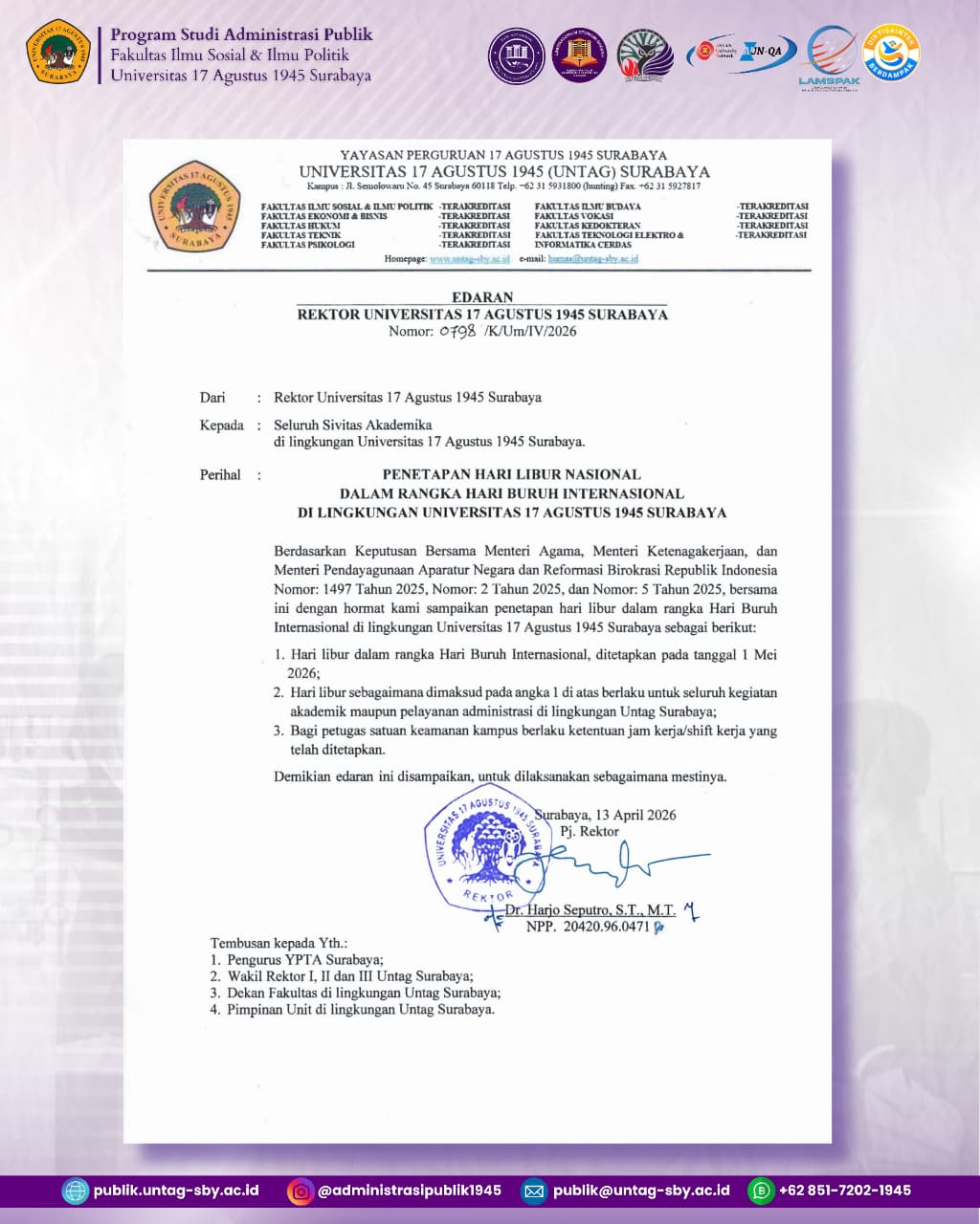 SURABAYA – Menindaklanjuti keputusan pemerintah mengenai hari libur nasional, Universitas 17 Agustus 1945 (Untag) Surabaya secara resmi menetapkan hari libur dalam rangka memperingati Hari Buruh Internasional (May Day) yang jatuh pada tanggal 1 Mei 2026.